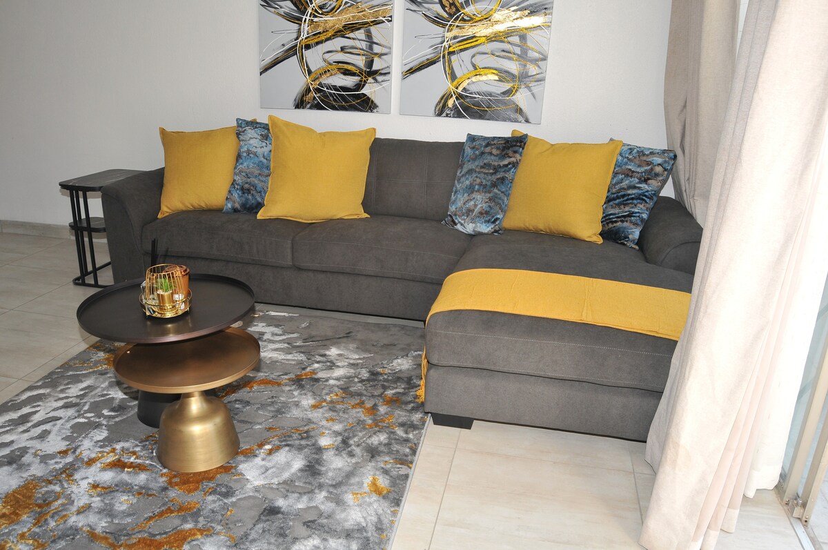 Una suite independiente con cocina situada en una zona con vigilancia las 24 horas, los 7 días de la semana, con tu propia entrada privada. Adecuado para 2 adultos + 1 niño en un colchón en el suelo. Amplia habitación en la planta baja con baño completo en suite. Cama tamaño king, cocina americana equipada. A 15-20 minutos del aeropuerto de ORTambo. Durante el desprendimiento de carga: inversor limitado/batería de respaldo que te proporciona luces, DSTV y wifi gratuito. Aparcamiento en la calle. Uso del jardín y la piscina. Un ambiente relajado y agradable, adecuado para viajes de negocios o de placer.
