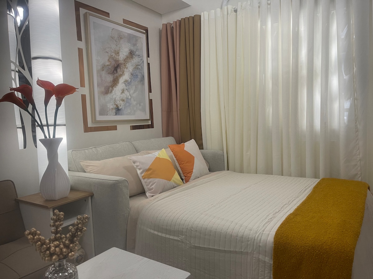 ¡Te damos la bienvenida a tu acogedora casa en Eastwood City! Este apartamento luminoso y elegante es perfecto para viajeros de negocios, parejas y vacaciones. ◆ Cama tamaño queen de calidad hotelera para un sueño reparador. ◆ Iluminación moderna e interiores luminosos y relajantes ◆ Aire acondicionado completo para mayor comodidad durante todo el día. ◆ Wifi rápido ideal para trabajar o transmitir ◆ Televisión inteligente con Netflix y YouTube ◆ Cocina pequeña bien equipada ◆ Baño limpio con ducha caliente y fría ◆ Sofá suave y diseño cálido perfecto para relajarse después de un largo día