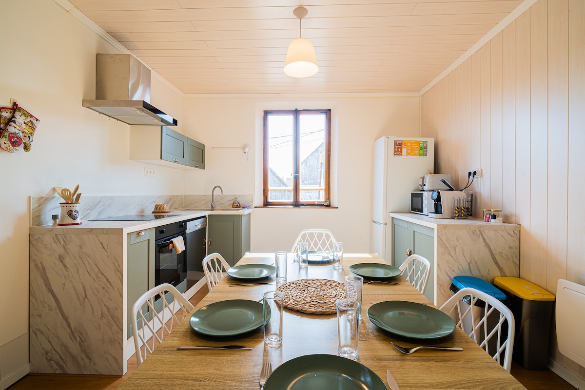 Descubra los tesoros de Alsacia desde esta antigua granja totalmente renovada. Dedicado a la relajación y al cuidado del cuerpo, disfrutará de un hermoso espacio luminoso, de prestaciones de alta gama y de materiales de calidad. Reserva posible para teletrabajo (wifi de fibra) Los amantes del running no duden en ponerse las zapatillas: les espera un recorrido magnífico. A 200 metros, los sábados por la mañana en la plaza del pueblo un pequeño mercado le permitirá llenarse de verduras. En su camino no se olvide de su baguette y algunos dulces. A su llegada, dos plazas de aparcamiento están reservadas para usted. Coge las llaves y entra sin dudarlo en este dúplex invertido para vivir momentos únicos de bienestar en un entorno cuidado. La casa adosada está totalmente equipada en tres niveles, la casa de campo consta en la planta baja de una entrada, un aseo y dos dormitorios, cada uno con su baño contiguo y privado. En la 1.ª planta, una sala de estar, una cocina equipada abierta al comedor y con vistas a una terraza, así como al espacio Wellness. En la 2.ª planta, un dormitorio con baño contiguo y un aseo separado. Ven a relajarte en esta magnífica casa rural que sigue el ritmo de las estaciones. Para relajarse, disfrute del espacio Wellness equipado con un Sanarium KLAFS y sillones relajantes. ¿Quizás te dejes tentar por la zona de tés? ¡Es hora de comer! Todos los utensilios de cocina le esperan para preparar buenos platos en una cocina agradable totalmente equipada y abierta al comedor. Para completar sus platos, disfrute con moderación de la bodega. Las botellas propuestas son adicionales a su estancia. David le invitará a descubrir varias variedades de uva de Alsacia y de otros lugares. Después de una buena comida, relájese en el salón, hay varios juegos de mesa a mano. ¡Que gane el mejor! Para los cinéfilos, hay un televisor a su disposición. Su día ha terminado. Muy contemporáneas, nuestras amplias habitaciones respiran comodidad, cada una equipada con baño con bañera o ducha, cama king-size doble o individual, secador de pelo, toallas, albornoces y escritorio. Disponibilidad Con una ubicación ideal en el corazón de la llanura de Alsacia, el alojamiento se encuentra a solo diez minutos de Colmar, ofreciéndole las comodidades de una gran ciudad y el encanto típico de una ciudad alsaciana. Una panadería se encuentra a 300 metros. Taxi Autobús Clasificación de Turismo 4 *