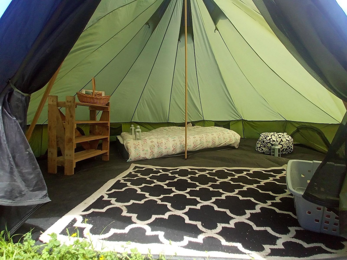 Rústica tienda de campaña Bellissima Bell, totalmente amueblada