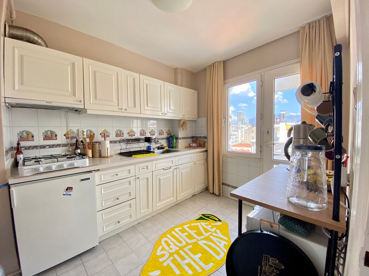 En el quinto piso, NO HAY ASCENSOR..5 KATTA ASANSOR YOKTUR. Barrio seguro y agradable NUEVO INTERNET ULTRARRÁPIDO DE 1000 MBPS. Gran vista al mar y al bulevar de la costa Netflix, Spotify y YouTube dentro de una televisión inteligente A solo 5 minutos caminando del ascensor histórico (Asansor). A 15 minutos a pie del centro de la ciudad de Konak A 5 minutos del paseo marítimo. Despierta con una vista directa al mar... A 5 minutos de la estación de tranvía (a 5 minutos de Konak y a 15 minutos del centro de la ciudad de Alsancak). Edificio antiguo y apartamento renovado