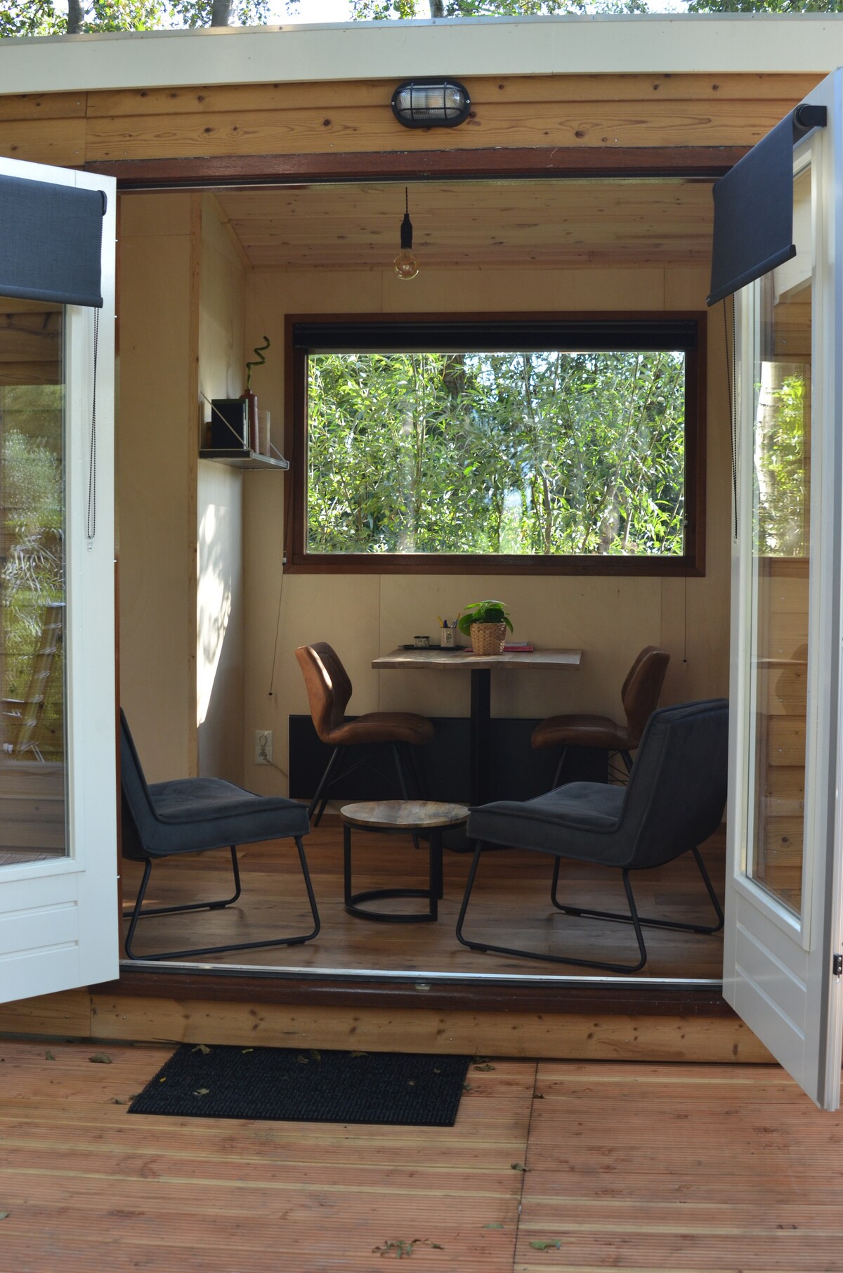 'Aquí está, minicasa', espacio independiente en una casa unifamiliar, Nijmegen. Desayuno 8 €, - en 'Meneer Vos'. Cama adicional para la tercera persona. Cerca de Goffertpark, hospitales, HAN/Radboud, centro comercial y naturaleza. Se puede llegar al centro de la ciudad en bicicleta y autobús. Planta baja con entrada privada. Estacionamiento gratuito en la calle. La "minicasa" cuenta con todos los servicios para una estancia independiente. Áreas comunes: “sala de jardín con salón + minibar”, hermoso jardín y sala de estar con fogata y asador.