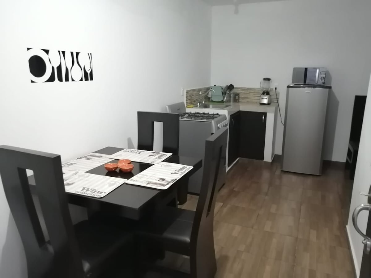 Nuestro departamento esta ubicado en primera planta Facil y Rapido Acceso La entrada es autonoma, por lo que puedes ingresar y salir dentro del horario establecido de 2pm a 10am Inmejorable ubicacion a una cuadra de una de las avenidas principales de la ciudad y a solo 5 min del centro de la ciudad Esta en una zona tranquila y segura Equipado con Cocineta y baño completo independiente, no se comparte con otros departamentos Enseres de cocina y blancos incluidos