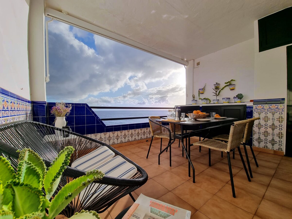 Un precioso apartamento de diseño, recientemente renovado con con impresionantes vistas de atardecer sobre el Océano desde su terraza. Primera línea al mar. Después de un largo día en la naturaleza, descansa en la cama King size (180x200cm) ----- A lovely apartment recently renovated with stunning views of the sunset, first line over the ocean from the terrace. Relax while reading, eating, or doing yoga. After a long day in nature, rest on the King size bed (180x200cm)