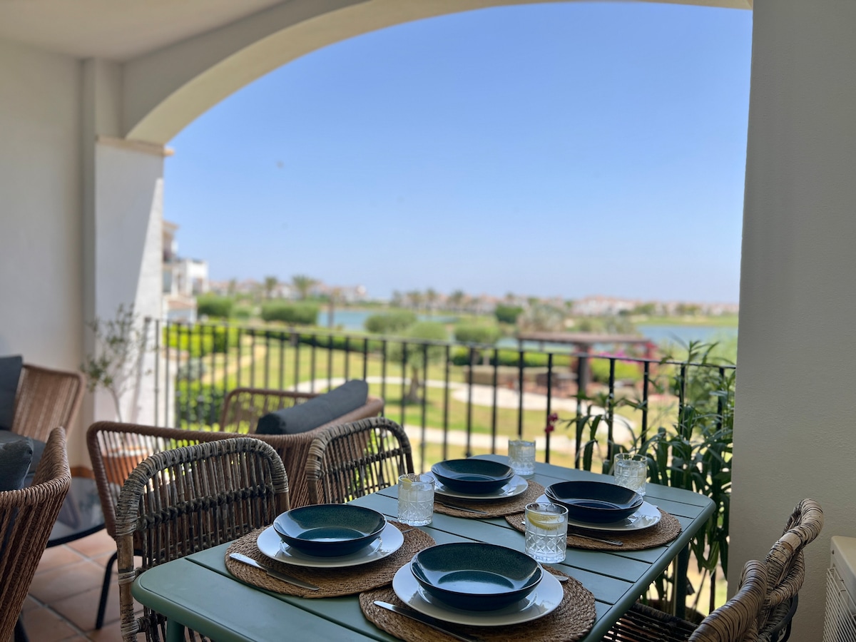 Stylish 2-bed apartment on La Torre Golf Resort with stunning golf & lake views. Enjoy a smart TV lounge, fully equipped kitchen, modern bathroom, and two Juliet balconies. First floor with lift access and free secure underground parking. Relax on the private terrace or explore 16 pools, tennis/padel courts, play areas, and restaurants. Just 20 mins to Mar Menor beaches—perfect for golf, family fun, or a peaceful break in the sun!