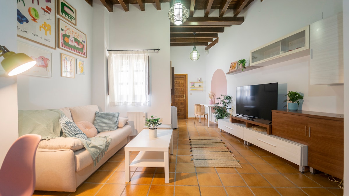 La Carrera del Darro es uno de los parajes más románticos y de mayor encanto de Granada. Este espacio, mundialmente conocido por su original vista de la Alhambra en contrapicado, ofrece una imponente y majestuosa visión del palacio nazarita que embruja a todo visitante. Justo entre uno de los puentes históricos de este paseo, El Puente Espinosa, y los restos del Puente Cadi podrás alojarte en este piso con cuidada decoración que lo hace único para una estancia inolvidable sobre el río Darro