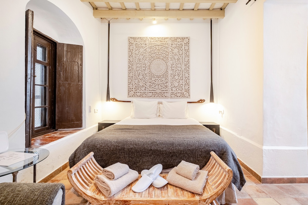 Ubicado en la casa más antigua de Tarifa. Originalmente un convento en 1628, en el corazón del casco antiguo de Tarifa, pero en una zona muy tranquila lejos de la parte más ruidosa del casco antiguo. Para vivir el corazón de Tarifa, sus bares de tapas, restaurantes y tiendas. La playa está a sólo 7 minutos a pie. La zona exterior es un patio común con otros vecinos. Apartamento tipo estudio (un único espacio) de 1 dormitorio y 1 baño en planta baja del edificio. Recientemente reformado.