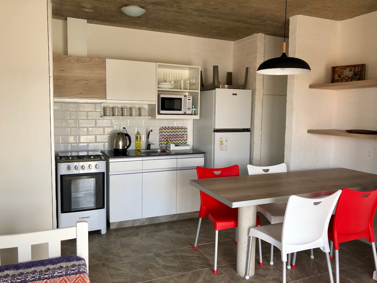Casa tipo estudio a estrenar con un estilo rústico-industrial que ofrece un lugar cálido, espacioso y funcional. Muy bien equipada para que disfrutes tus vacaciones. Zona muy tranquila. Ideal para parejas y parejas con un peque. Muy buena conexión a internet para trabajo remoto. Aire acondicionado y estufa a leña. Estamos a 3 cuadras de la principal de La Pedrera y a 8 de la playa. Incluimos ropa de cama y toallas.