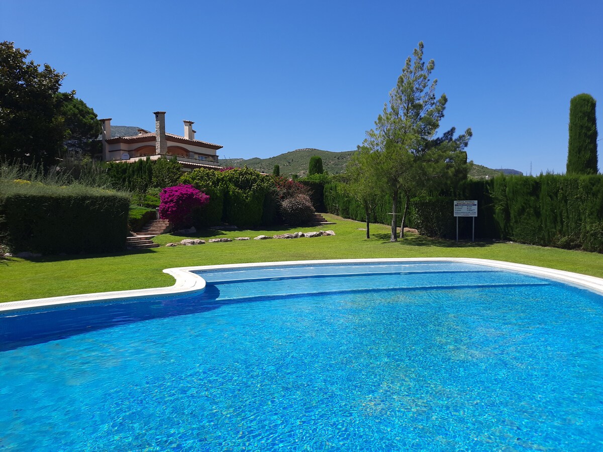 Rompe con tu día a día y relájate en este oasis de tranquilidad.Casita en la montaña a 8 minutos de la playa, con enorme jardín, porche, pequeña piscina y bbq. Desayuna mirando la montaña y escuchando el sonido de los pájaros. La casa cuenta con una alarma antiokupas con fotodetector en el garaje (sector cerrado y fuera del alquiler)un volumetrico sin lente ni cámara. Debido a los últimos incendios las bbq están prohibidas por ley de junio a octubre Aceptamos 1 mascota por alquiler.