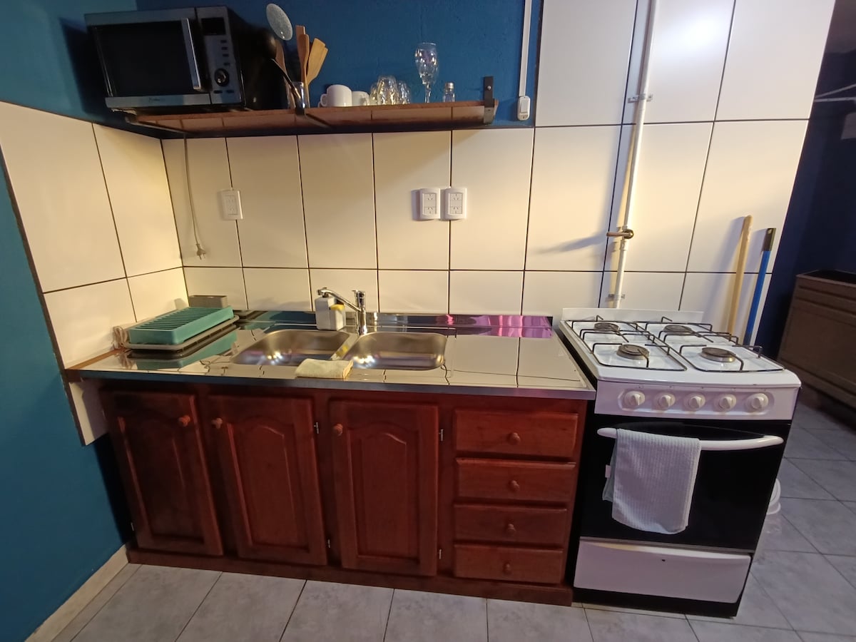 Apart totalmente equipado: Una habitación y un sommier en el comedor con uno extra debajo (4 plazas). Camas de 2 mt. Estamos a una cuadra de la calle principal, supermercados, bares y a tan solo 400 mts del comienzo de los senderos. Se ofrece desayuno seco el cual consta de café molido, cacao en polvo, azúcar, una variedad de tés y una mermelada.