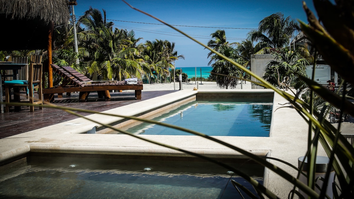 Direct access to the beach. Beachfront apartment. Terrace sea view. El Cuyo is a small fishermen village, faraway from the noise, traffic and crowds of people of the big cities . You will find an excellent beach with the white sand of the Caribbean and the calmed water of the Gulf of Mexico. This peaceful, harmonious, quiet, calm town invites you to rest, read, meditate, share time, friendship and love. People come from all around the world to practice kitesurf in our sea.