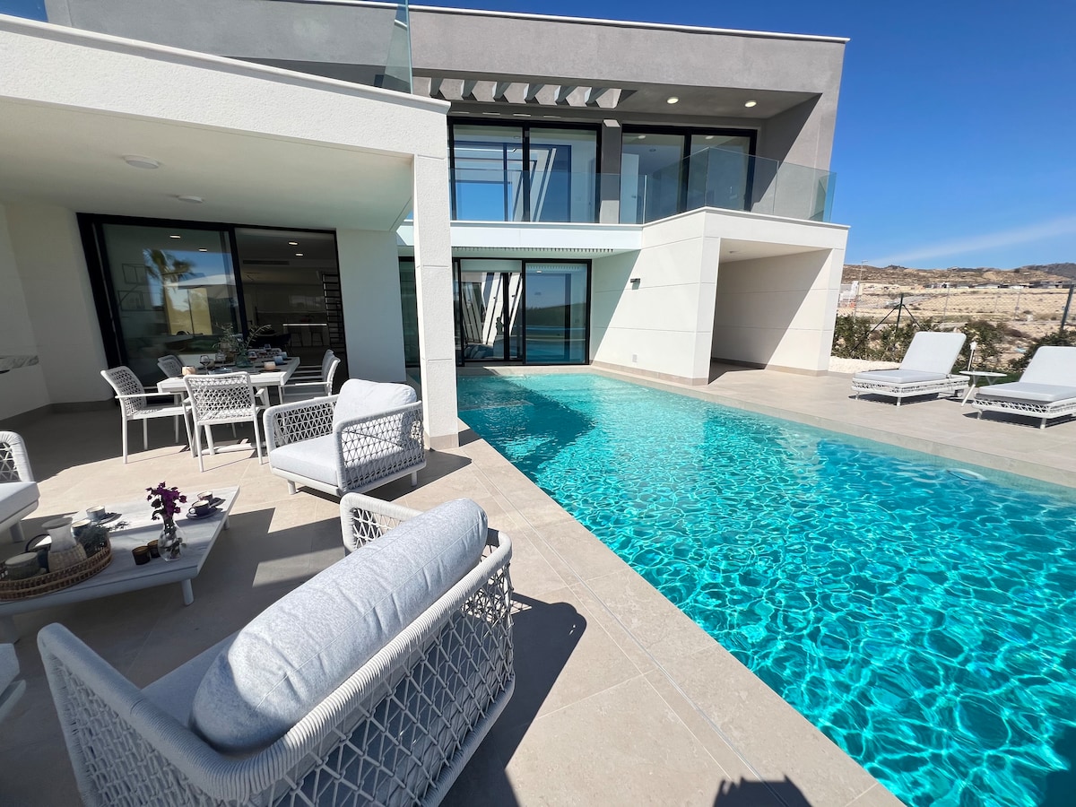 Sumergete en la Serena del Mar, una lujosa y muy bien equipada Villa con piscina privada + Yacuzzi, mucho espacio exterior y un diseño moderno y colorido. La vivienda destaca por su amplitud, claridad y comodidad. Es perfecta para familias o parejas que quieren disfrutar de un espacio limpio, pero calido y espacioso pero acogedor. Ven a esta casa que podria ser tu hogar temporal, cerca de la playa, el centro y a solo 20 metros de un Mercadona. La comodidad en su mayor expresion