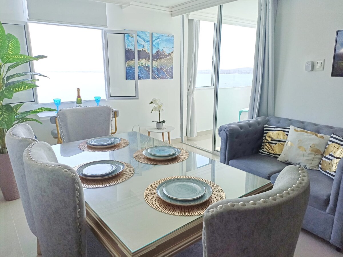 Increíbles vistas al mar. Elegante apartamento con gran terraza frente al mar. Situado en una zona estupenda y segura, cerca de dos hermosas playas. El edificio está rodeado de restaurantes, supermercados y farmacias. La playa está a pocos minutos a pie del edificio y encontrarás deportes acuáticos y pequeños barcos para ir a la isla de Tierra Bomba. Puedes ir al centro histórico en 10 minutos en taxi.