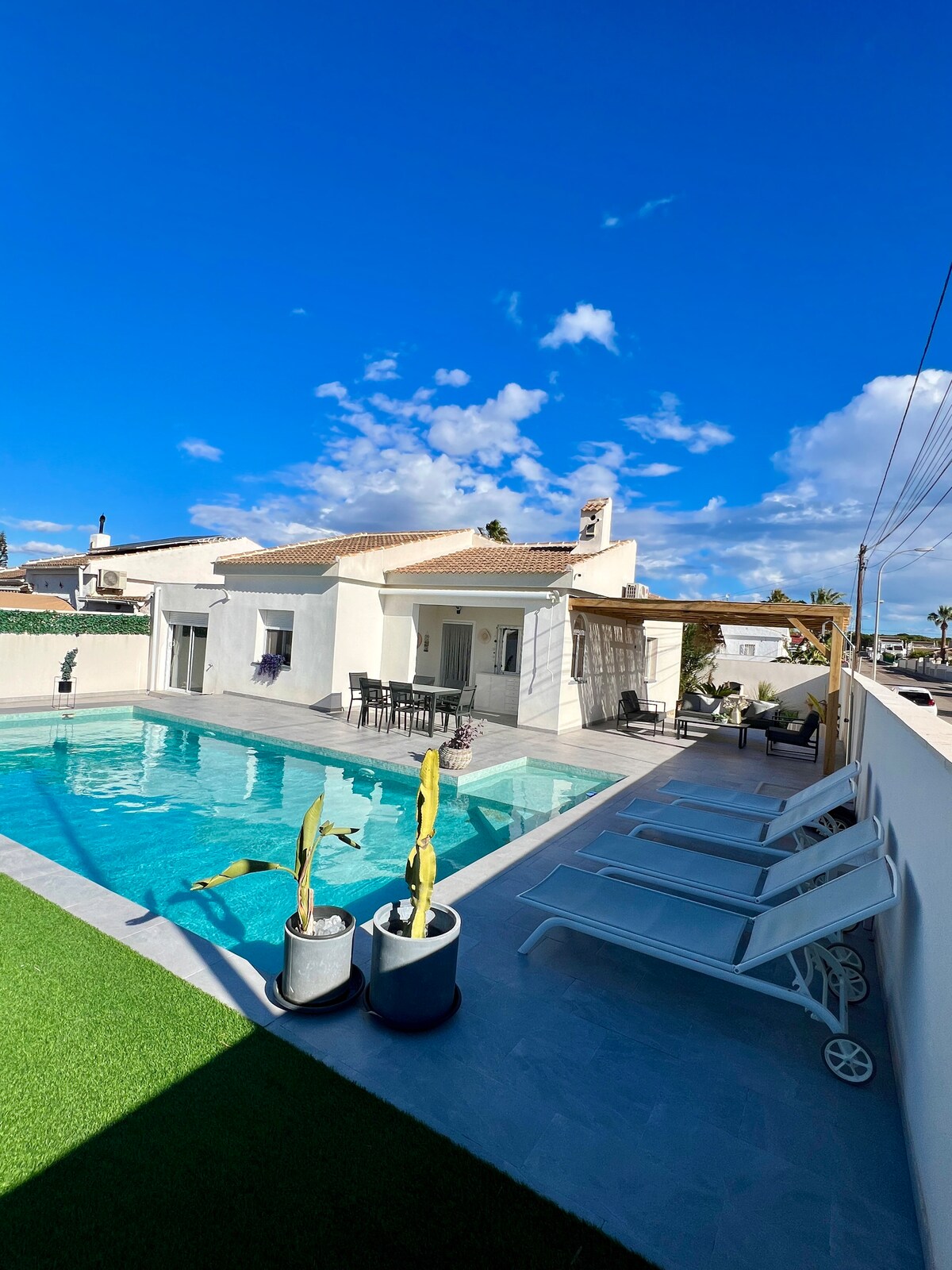 Golf, playa, bares, restaurantes, gran ciudad o relajación tranquila. Trae a tu familia o amigos y disfruta de este elegante lugar para hospedarte. La nueva villa de lujo tiene una variedad de servicios. Jardín privado y zona de piscina con varias áreas de estar, tumbonas y barbacoa, perfectas para relajarse al aire libre. Puedes divertirte en tres pisos con una gran terraza en la azotea donde puedes disfrutar de la vista de la ciudad y hacia el mar. Aire acondicionado e internet rápido. Ofrecemos 3 camas dobles de 160*200 y 4 camas individuales de 90*200.