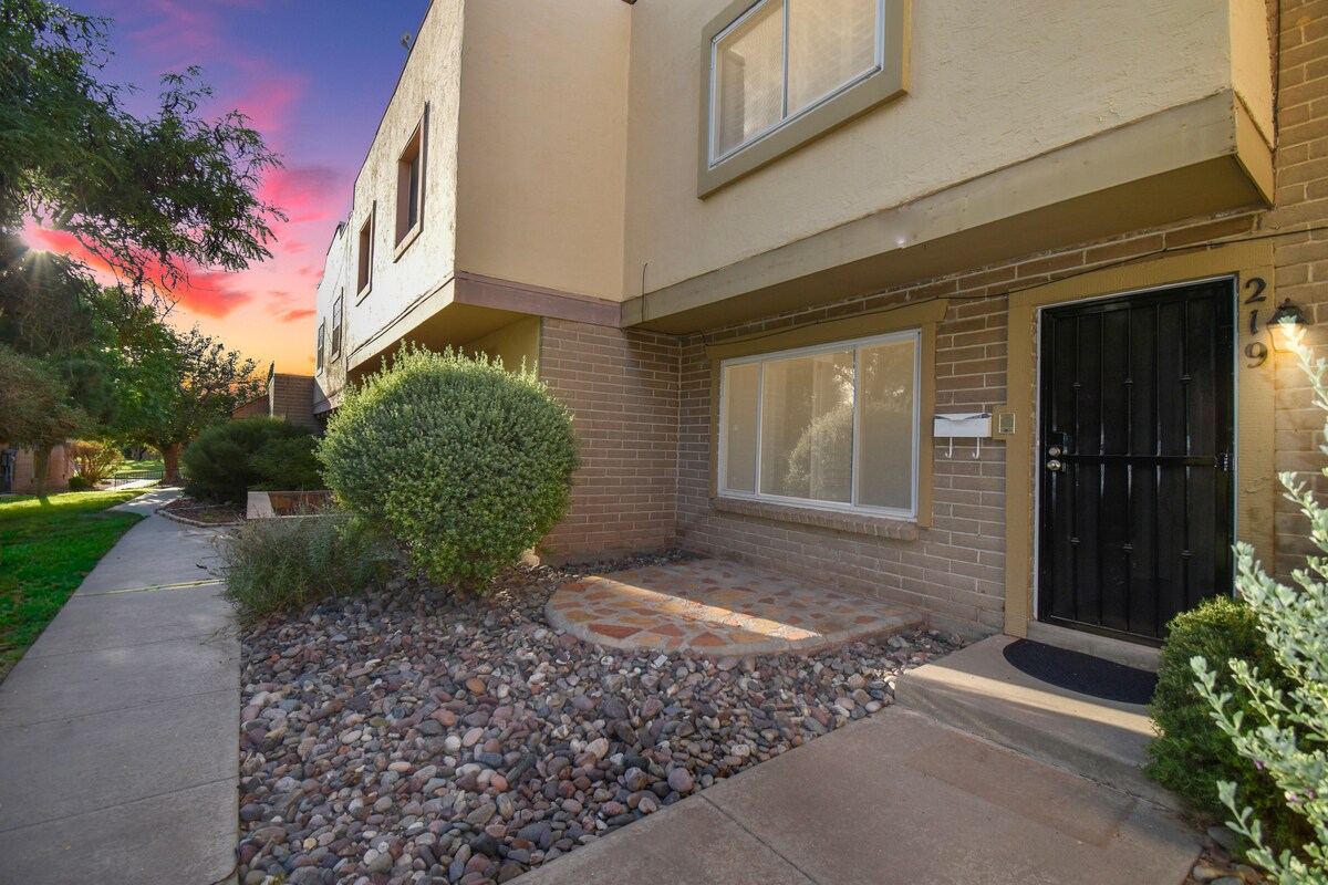 Elegante casa adosada en Westside en Thunderbird Sutton Place Townhomes. Vida tranquila en la montaña, rodeada de exuberantes paisajes verdes. Las características incluyen: hermosas y modernas actualizaciones | 1,320 pies cuadrados | 2 dormitorios | 2 baños | sala de estar con chimenea | cocina actualizada | comedor con puertas francesas que conducen al patio trasero | wifi | piscina reluciente | lavadora y secadora | a pocos minutos de restaurantes, Mesa St, Sunland Park Mall, Sunland Park Casino & Race Track, I-10, Downtown, Utep y campo de golf Coronado Country Club.