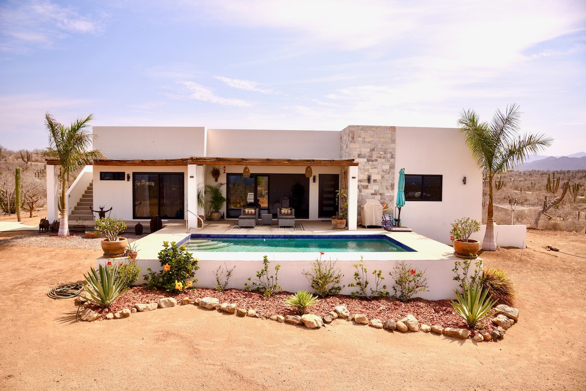 ¡Te damos la bienvenida a Villas Tres Tierras! Esta impresionante casa moderna de 2 dormitorios y 2 baños cuenta con una hermosa piscina situada en una extensa propiedad de 0,9 acres. A solo 5 minutos en auto o a 10-15 minutos a pie, encontrarás una de las playas para nadar más impresionantes de Baja Sur. Tres Tierras es el escape perfecto del ajetreo y el bullicio de la vida diaria. Esta escapada tranquila es tu casa lejos de casa, donde puedes relajarte y rejuvenecer en paz. ¡Te damos la bienvenida a Baja!
