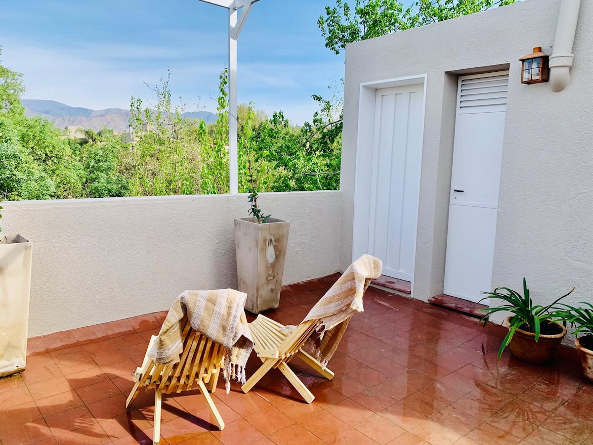 Un loft único, un paisaje inolvidable!! A 25km. de la ciudad de Mendoza, en los caminos del vino , zona vitivinicola de Perdriel, Lujan de Cuyo, cuna del vino Malbec. En su entorno ,hay granjas , bodegas y restaurantes. Ideal para descansar, turismo aventura y como base de excursiones a alta montaña(30 km), Chacras de Coria(10Km) o Ciudad Lujan de Cuyo(5km). Para 2 personas o grupo de 4 , que no requieran privacidad de dormitorios. Se puede llegar en taxi, pero lo aconsejable es el automóvil.