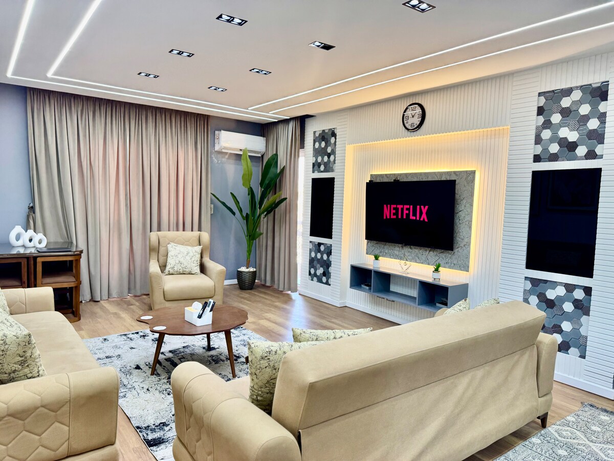 Escapa del bullicio de la ciudad y relájate en este tranquilo estudio de planta abierta de 90 metros cuadrados. Disfruta de una amplia sala de estar, una cómoda cama tamaño king y una cocina totalmente equipada inigualable. Ubicación: a solo 5 minutos en coche de AUC, The Spot Mall y Point 90 Mall, a 25 minutos del aeropuerto de El Cairo. Envíame un mensaje para obtener más información o reserva tu estancia al instante. Puedo ayudarte a planificar tu viaje, recomendarte auténticos restaurantes egipcios o guiarte a las joyas ocultas de la ciudad.