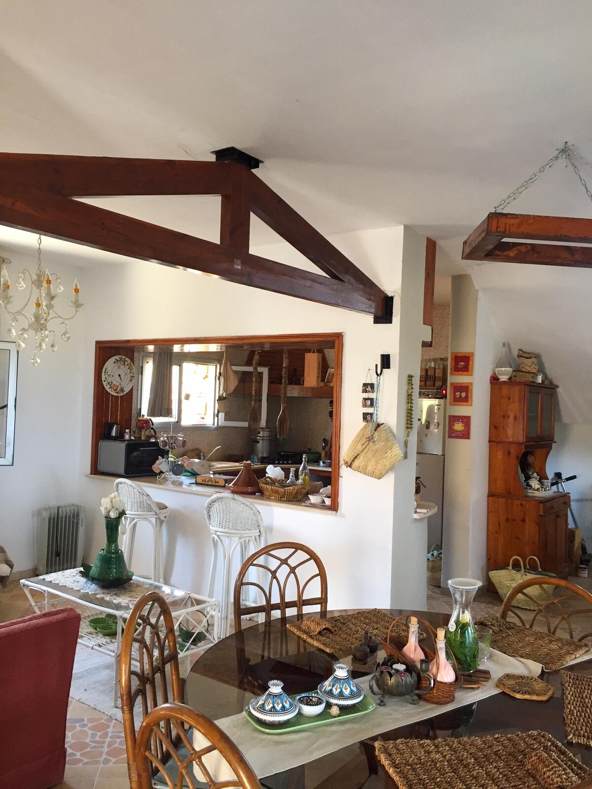 Niché au 4ème et dernier étage, Le Perchoir Bohême est lumineux, avec vue dégagée, au centre de Tabarka. Accessible par escalier, cet appartement au style bohème naturel mêle confort et ambiance artisanale tunisienne. 1 chambre modulable, salon (2 couchages d’appoint), cuisine ouverte, salle d'eau moderne, balcon et accès toit-terrasse avec vue mer, ville et fort Genois. A 2 pas des commerces, restaurants, taxis et plages. A proximité d'un hammam et d’une mosquée, une immersion locale garantie.