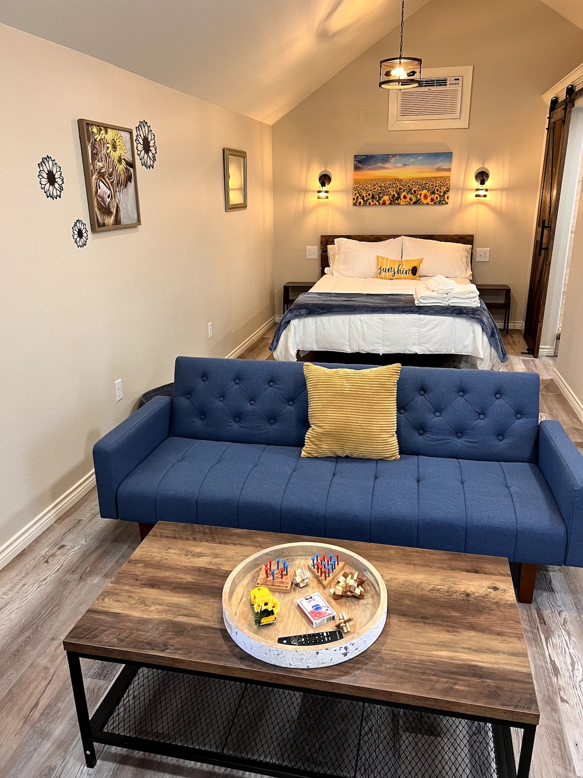 The Sunflower, 1 de 4 acogedoras cabañas escondidas en una granja de 5 acres, cerca de la naturaleza sin sacrificar la comodidad. Sal a tu pequeño porche, perfecto para tomar un café por la mañana o ver las puestas de sol. Como parte de la experiencia, puedes saludar a nuestros amigables pollos deambulando por los terrenos, agregando un toque único de vida agrícola a tu estancia. Ven a sumergirte en el ritmo tranquilo de la vida de la granja de Texas, a pocos minutos de Cooper's Live (1/2 milla) y Christoval Winery (2 millas).