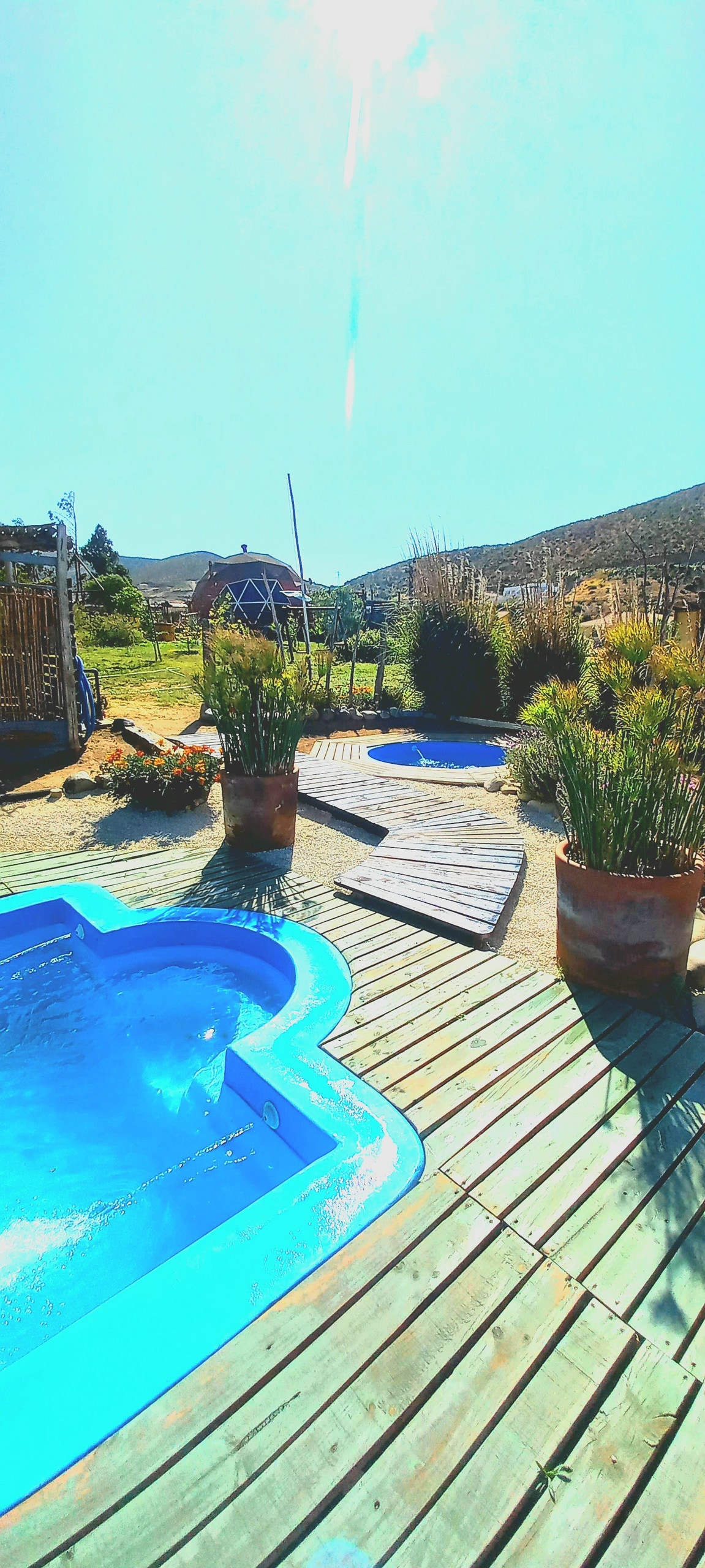 Hermoso domo privado, con Piscina y tinaja exclusiva, enclavado en medio de las montañas de Cochiguaz, Valle de Elqui. Ideal para descansar y desconectarse en medio de la naturaleza en completo silencio, observar las estrellas en torno a una fogata, a los pies del Monte Cancana, monte venerado por las antiguas culturas Molle y Diaguitas o bien desde la habitación a través de la cúpula vidriada. La tinaja es de libre disposición, pero deben traer su leña y ocuparse del encendido.