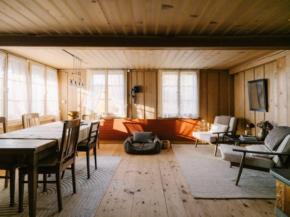 El ático, amplio y único (114 m²), dispone de dos dormitorios separados con camas dobles y una sala de estar y comedor abierta con una cocina ultramoderna y un cómodo sofá cama que puede acomodar a dos personas más. El gran baño, con su ventana de buhardilla y vistas al Napf, ofrece un espacio para el descanso y la relajación. La logia con vistas al pueblo de Hergiswil, situado más abajo, es un punto culminante absoluto. Junto a la entrada del apartamento se encuentra el lavadero con lavadora.