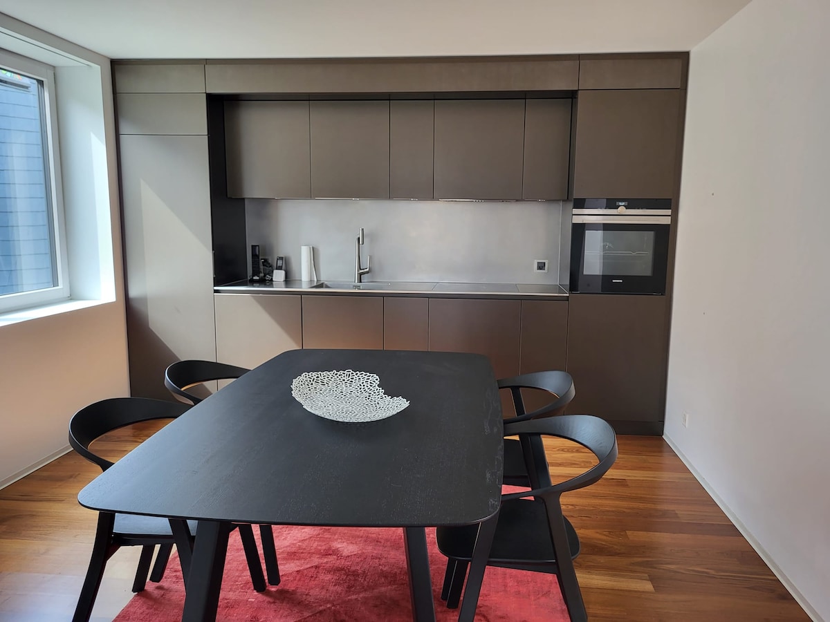 Magnífico apartamento moderno de 120 m2, situado en el 1.er piso , con una magnífica terraza de 28 m3 , vistas al lago. Materiales de calidad, estufa sueca, piscina y sauna a pocos metros en el mismo piso. Magnífico bar de vinos en la planta baja, con un restaurante que ofrece productos de muy buena calidad. Local para esquís, aparcamiento subterráneo, lavadero y bodega en el apartamento.