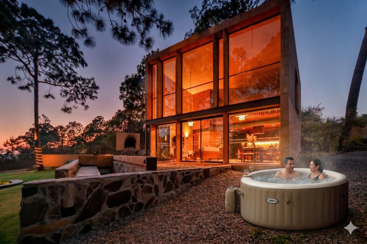 Escápate a una cabaña de lujo en el corazón del bosque, rodeada de pinos y silencio absoluto. Un refugio íntimo diseñado para parejas que buscan privacidad y conexión. La habitación es totalmente privada e integra jacuzzi, cine con proyector y sound bar, además de baño y sauna exclusivos con acceso privado. El sofá cama se ubica en la sala y puede alojar hasta 2 personas adicionales. La cabaña cuenta con un solo baño. Un espacio elegante para una experiencia inolvidable.