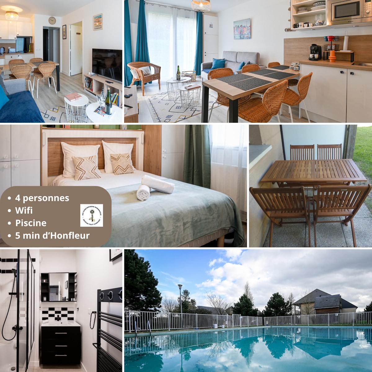 Studio lumineux 4 pers, piscine, 5 min d'Honfleur