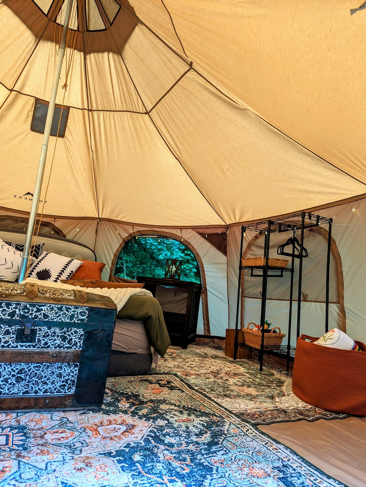 Relájate y sumérgete en la naturaleza en este lujoso refugio fuera de la red. Explora los senderos del bosque, relájate junto al fuego o reserva un encuentro con los animales. Hay un refrigerador y todas las herramientas que necesitas para cocinar sobre el fuego, ¡solo trae tu propia comida y hielo! La tienda tiene un colchón inflable tamaño queen, con espacio para sacos de dormir o colchones individuales en el suelo. No hay agua ni electricidad en el sitio.