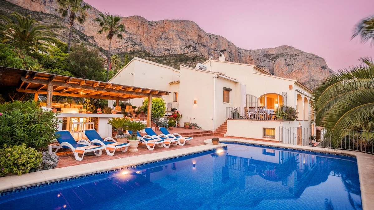 Casa muy privada en zona tranquila a los pies del Montgó con piscina de 13'5x 4'5mts y Jacutzzi. Soleada todo el dia con orientación Sur. A 2 minutos andando a una clínica privada, supermercado,cafetería y restaurantes. 3 minutos en coche al Campo de Golf. Consta de 3 dormitorios, salón amplio con chimenea, cocina totalmente equipada, dos baños . El salón y dos de los dormitorios tienen acceso al porche con vistas a la piscina y paisaje.Toda la casa tiene aire-acondicionado y calefacción.