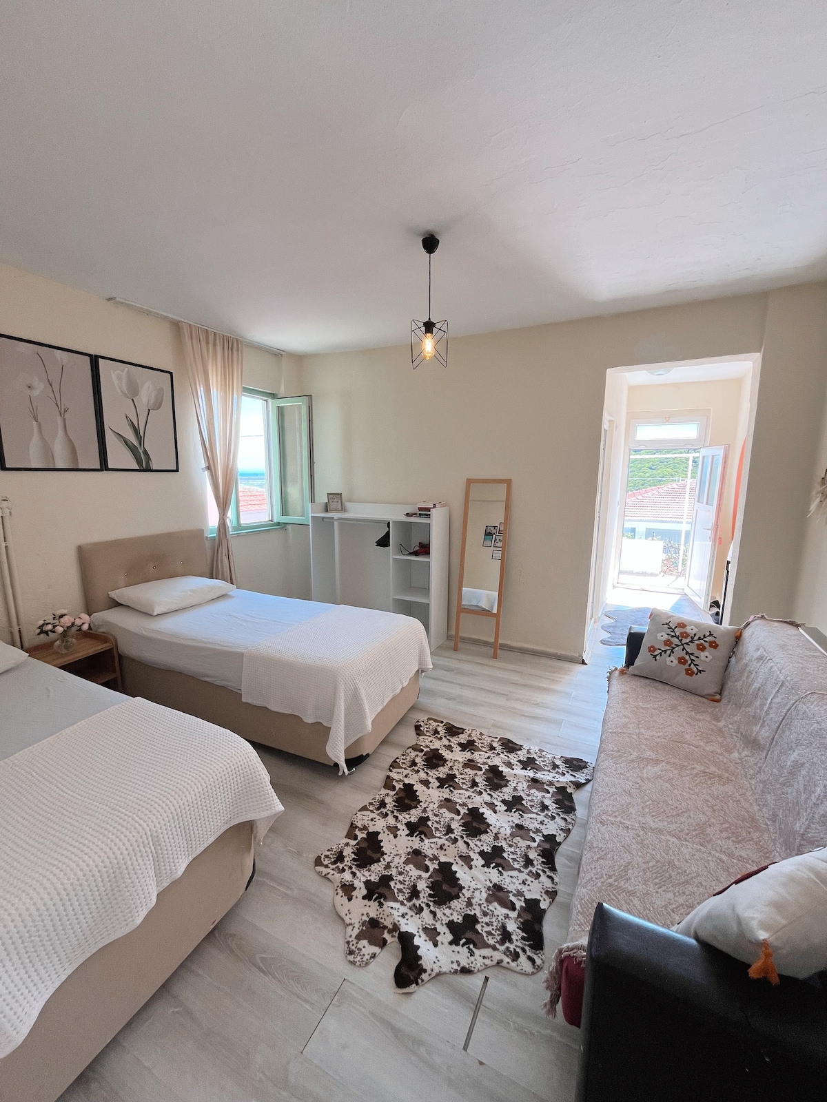 El apartamento consta de 1 dormitorio y 1 sala de estar. El dormitorio tiene 1 cama doble y el salón tiene 2 camas individuales, sofá convertible y cocina americana. A 2 o 3 minutos en auto de las playas más queridas de Kefalos/Aydıncık de la isla. Los lugares de surf, el baño de barro y el lago de sal están a 2 km. Hay un grupo de asientos en el balcón al aire libre. Puedes hacer una barbacoa. Puedes estacionar tu coche de forma gratuita frente al apartamento.