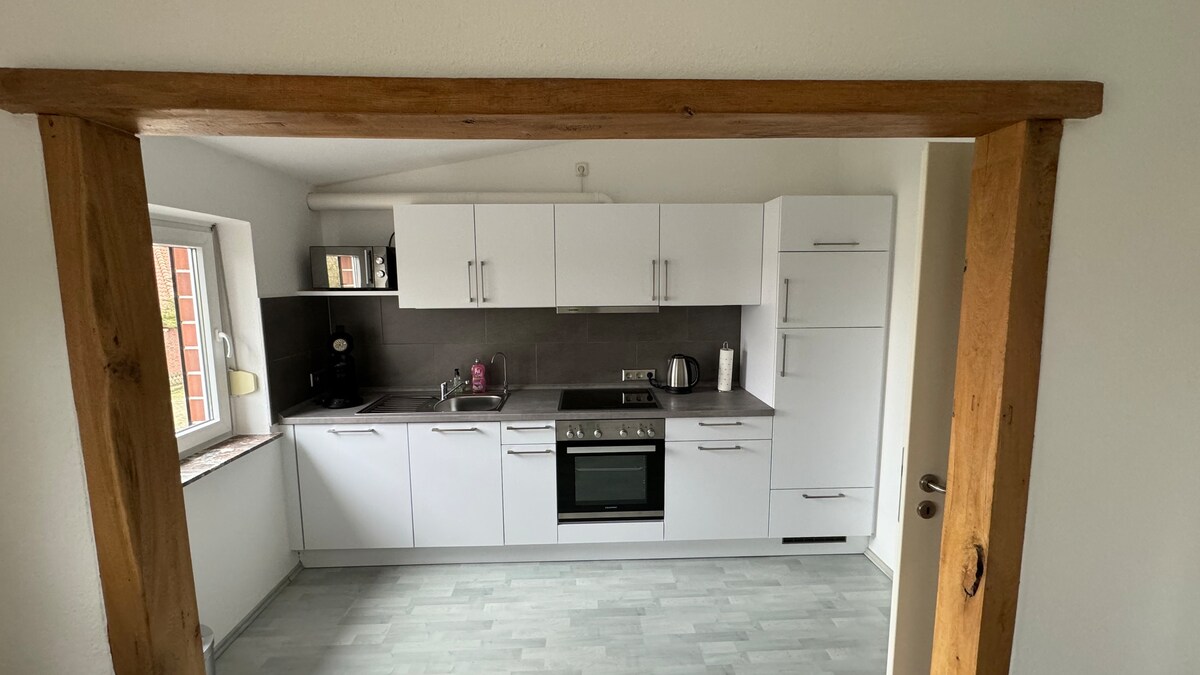 Ofrecemos un apartamento en nuestra pequeña granja. El apartamento tiene unos 32 metros cuadrados, una pequeña cocina (sin estufa) y un baño con ducha... está completamente solo, con asientos afuera. El autobús y el supermercado están en las inmediaciones y el centro de la ciudad está a unos 20 minutos en bicicleta. Estacionamiento gratuito en las instalaciones Cocina: nevera con nevera, cafetera Nespresso, tostadora, microondas) Cama 160x200 Se puede reservar una cama de bebé/cuna por 10 €