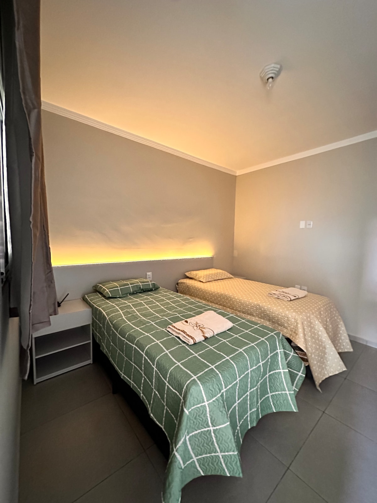 Apartamento estudio de 30 m², sala de estar con TV inteligente y sofá cama, aire acondicionado, cocina, baño privado, dormitorio, lavandería, patio y garaje cubierto con puerta automática y 8 espacios giratorios. Hay 6 kitnets en total. A menos de 5 minutos en auto del centro de la ciudad. No es necesario incluir a los niños de hasta 10 años en la reservación.