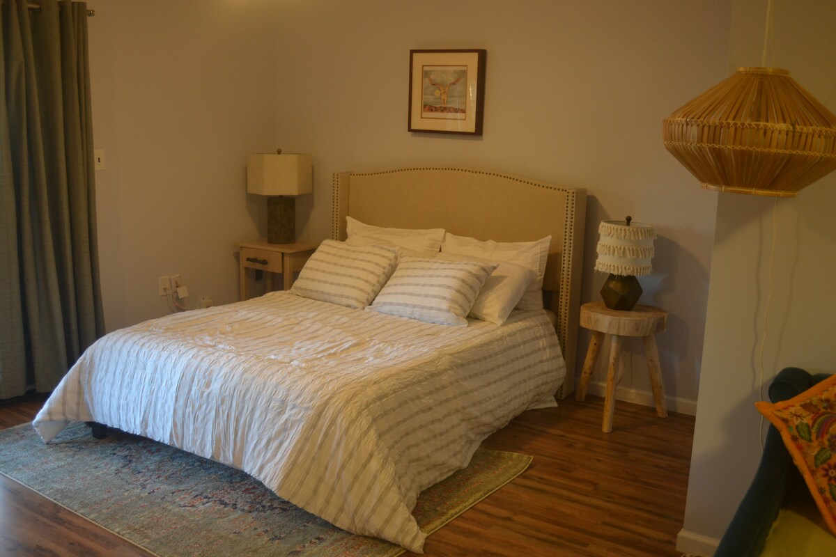 Tucked away in a peaceful, wooded setting near DC, this apartment with a private entrance features a bright, airy layout designed for comfort. Living/dining/kitchen with fireplace, 65” TV, books & games, fully stocked kitchen, and workout gear. King bedroom with famously comfy memory foam mattress, second bedroom with twin daybed + pop-up trundle, full bath with shower/tub combo, gigabit Wi-Fi, desks, porch + grill. 10 min to Metro, 20 min to DC, and 5 min to Greenspring Senior Living Community.