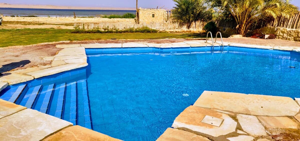 La escapada perfecta, a solo 140 km de El Cairo. Disfruta de esta villa privada, céntrica y soleada en el corazón del pueblo de Tunis, con un hermoso jardín con vistas al lago Qarun, donde podrás relajarte después de un largo día de explorar todas las experiencias auténticas que el pueblo de Tunis tiene para ofrecer. Estamos a poca distancia a pie de todos los lugares de interés famosos. A 2 minutos a pie de Lazib Inn. Nuestro enorme espacio incluye 4 dormitorios, 3 baños y 2 cocinas. La casa está dividida en dos plantas para mayor privacidad.