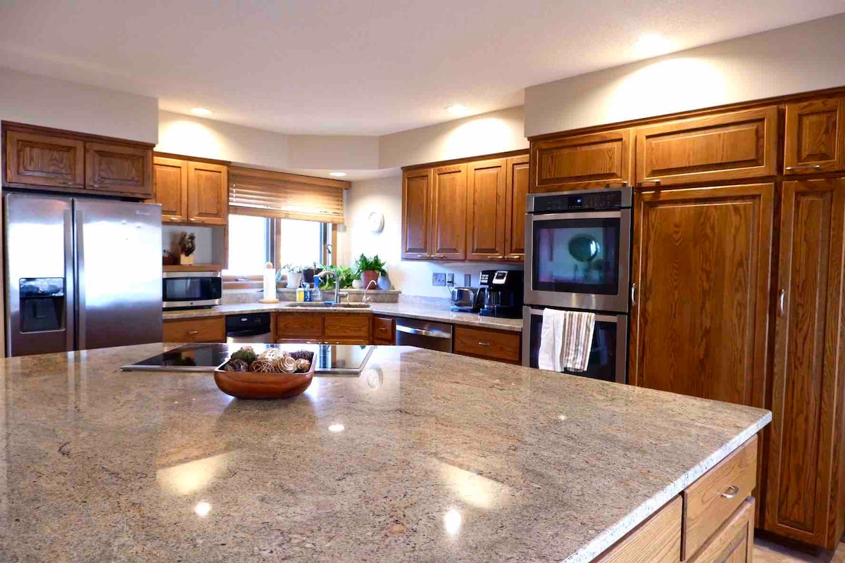Este lugar es perfecto para familias y reuniones porque es muy espacioso. Hay encimeras de granito, suelos de madera y alfombras limpias. Una cocina completa arriba y una zona de cocina abajo. Dos lavadoras y secadoras si necesitas lavar la ropa. Las tres salas de estar separadas permiten diferentes entornos de reunión. La parrilla está en la terraza y hay propano si está disponible. La cocina tiene una encimera completa y dos hornos. Hay una cafetera Keurig y tazas K para ti.