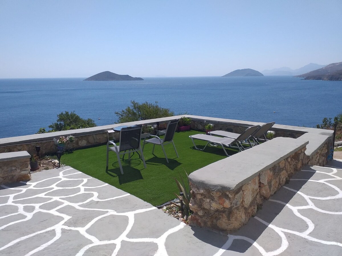 Kastelli Blu Residences Greek Island luxury accommodation. Kastelli Blu is a beautiful Greek island holiday house for rent. A modern Greek villa recently renovated by an interior designer, this is one of Kalymnos' few absolute waterfront holiday houses available. A path to the sun-bleached rocks & water from the house, limestone mountains behind the house for the ultimate in privacy. The villa is ideally situated in the climbing belt and is located directly below several climbing sites.