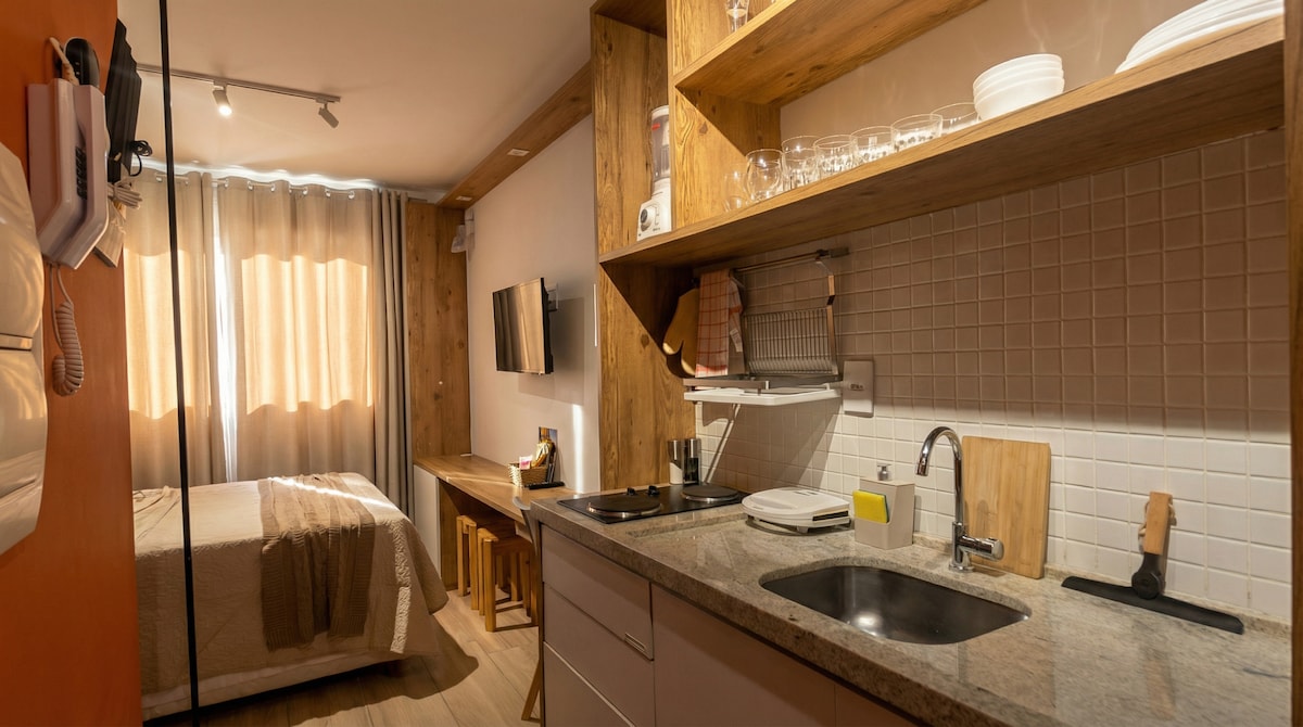 ** CONDICIONES ESPECIALES DE RESERVACIÓN ** Las fechas comprendidas en estos intervalos solo se pueden reservar juntas en 2026/2027: - Natal: del 23/12 al 26/12 - Reveillon: del 30/12 al 1/02 - Yemanjá: del 01/02 al 03/02 - Carnaval: del 4 al 9 de febrero ------------------------ Cómodo estudio con una excelente ubicación en el barrio bohemio de Río Vermelho, a 100 metros del Largo de Santana (la famosa Praça da Dinha) y la Rua da Paciência, y lleno de bares, restaurantes, establecimientos y opciones de ocio en los alrededores. ¡Te damos la bienvenida!