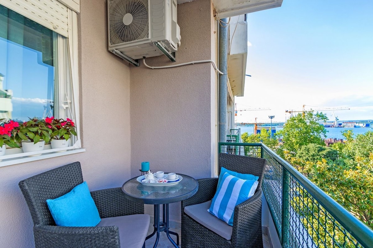 Hermoso apartamento renovado, con vista al mar y ubicación perfecta. A 1 km del centro de la ciudad, a 800 metros de las playas más hermosas. El apartamento (44 m2) consta de una gran sala de estar comedor de planta abierta con cocina totalmente equipada y sofá cama, baño grande, dormitorio con cama tamaño king y gran terraza privada. WIFI gratuito, varios canales de televisión internacionales, aire acondicionado.