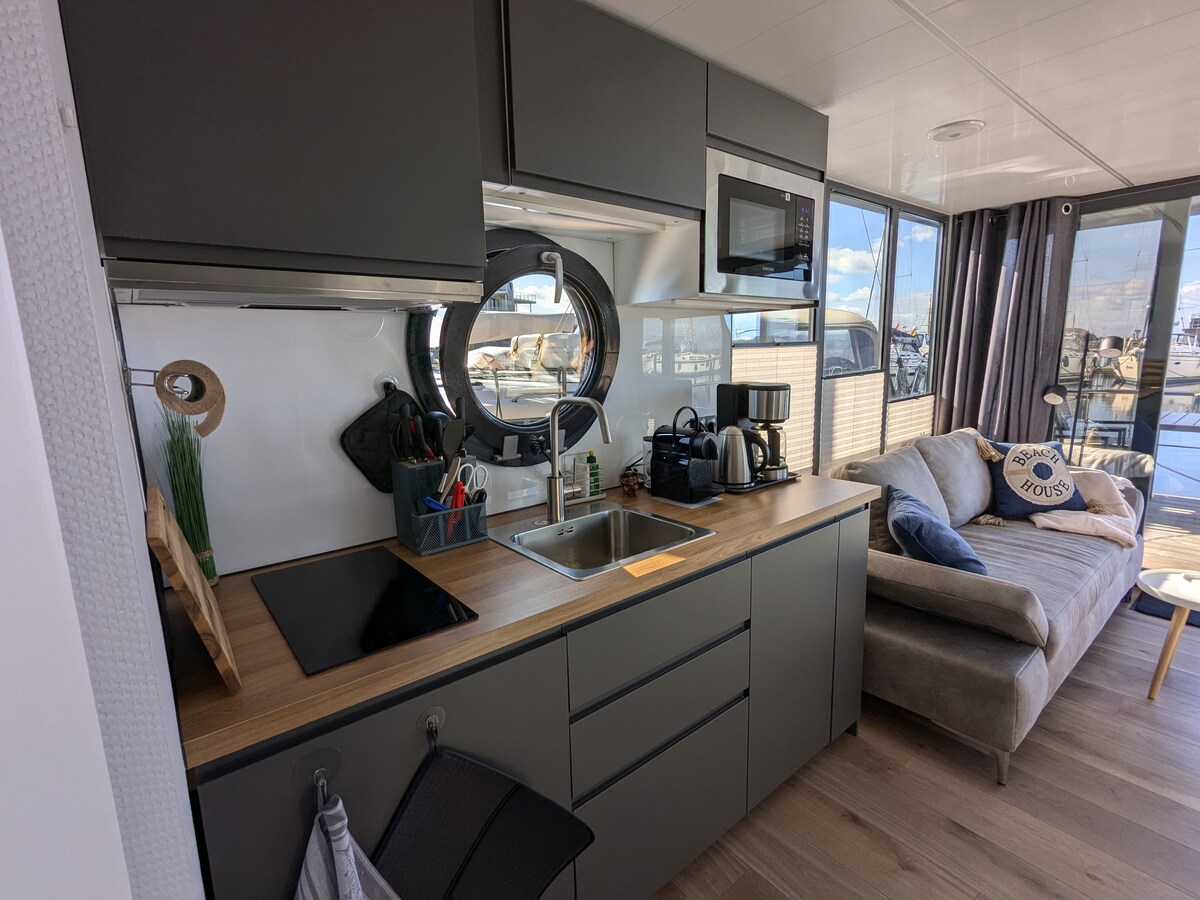 La cómoda casa flotante ofrece hasta 5 personas en unos 35 m² de espacio suficiente para pasar unas vacaciones muy especiales. Ideal para 2 adultos y 2 niños. Directamente en el agua puedes encontrar paz y relajación en la gran tumbona o puedes sentarte en la terraza protegida por el viento y ver a los patrones mientras entras y sales.