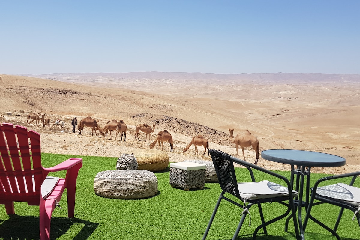 ** Guests from Israel: Your price does not include 18% VAT, which must be paid separately to the property owner. Contact us for details. ** ** No pets allowed ** Minimum age of guests: 25 Marvin's Place offers high quality accommodation for couples in a relaxed atmosphere. Enjoy our beautiful wooden deck overlooking the captivating shapes of barren desert mountains and the distant Dead Sea on the horizon, the silent breeze of desert wind and a flock of camels strolling by.