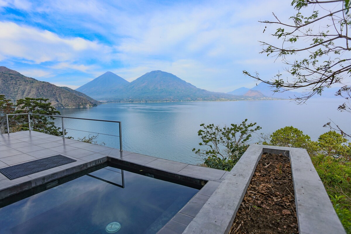 Disfruta del lago Atitlán como nunca antes desde esta moderna y elegante villa encaramada sobre el agua. Despiértate con vistas panorámicas, relájate en tu jacuzzi privado al aire libre o relájate en el espacio al aire libre bajo las estrellas. Con una cocina totalmente equipada, cama tamaño king, aire acondicionado y wifi rápido, este tranquilo refugio cuenta con todo lo necesario para una estancia perfecta en el lago. A pocos minutos de la encantadora ciudad de San Antonio Palopó, es el lugar ideal para disfrutar de la naturaleza, la tranquilidad y las puestas de sol inolvidables.