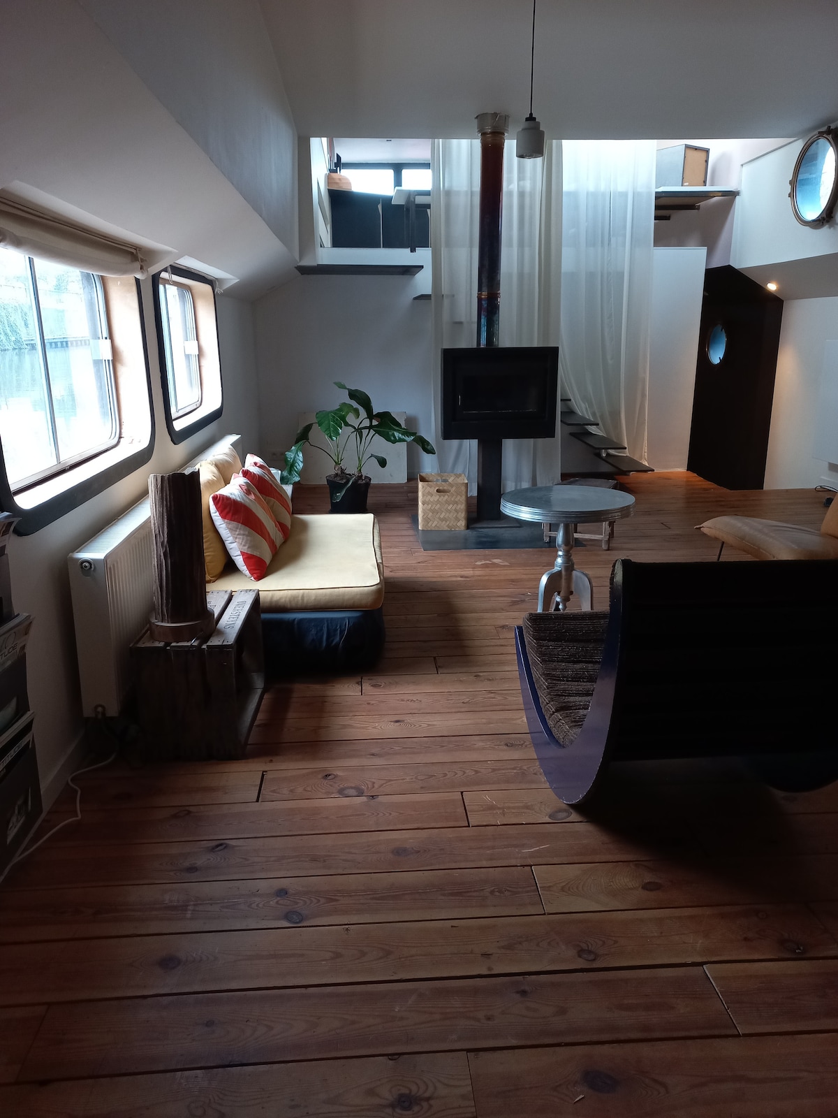 Acogedor pero espacioso y cálidamente decorado apartamento de diseño en mi casa flotante, la Aurelia Feria. - a 15 minutos a pie del centro de la ciudad y a 2 minutos a pie de la estación de tren. - Zona exterior con tumbonas en el agua, junto a la bicicleta y sendero para caminar alrededor de la nueva zona del Gante Center: de Nieuwe dokken, con al final de una playa. - Cama doble muy cómoda en una habitación separada con una hermosa bañera junto al agua, en el agua, para estar en el agua.