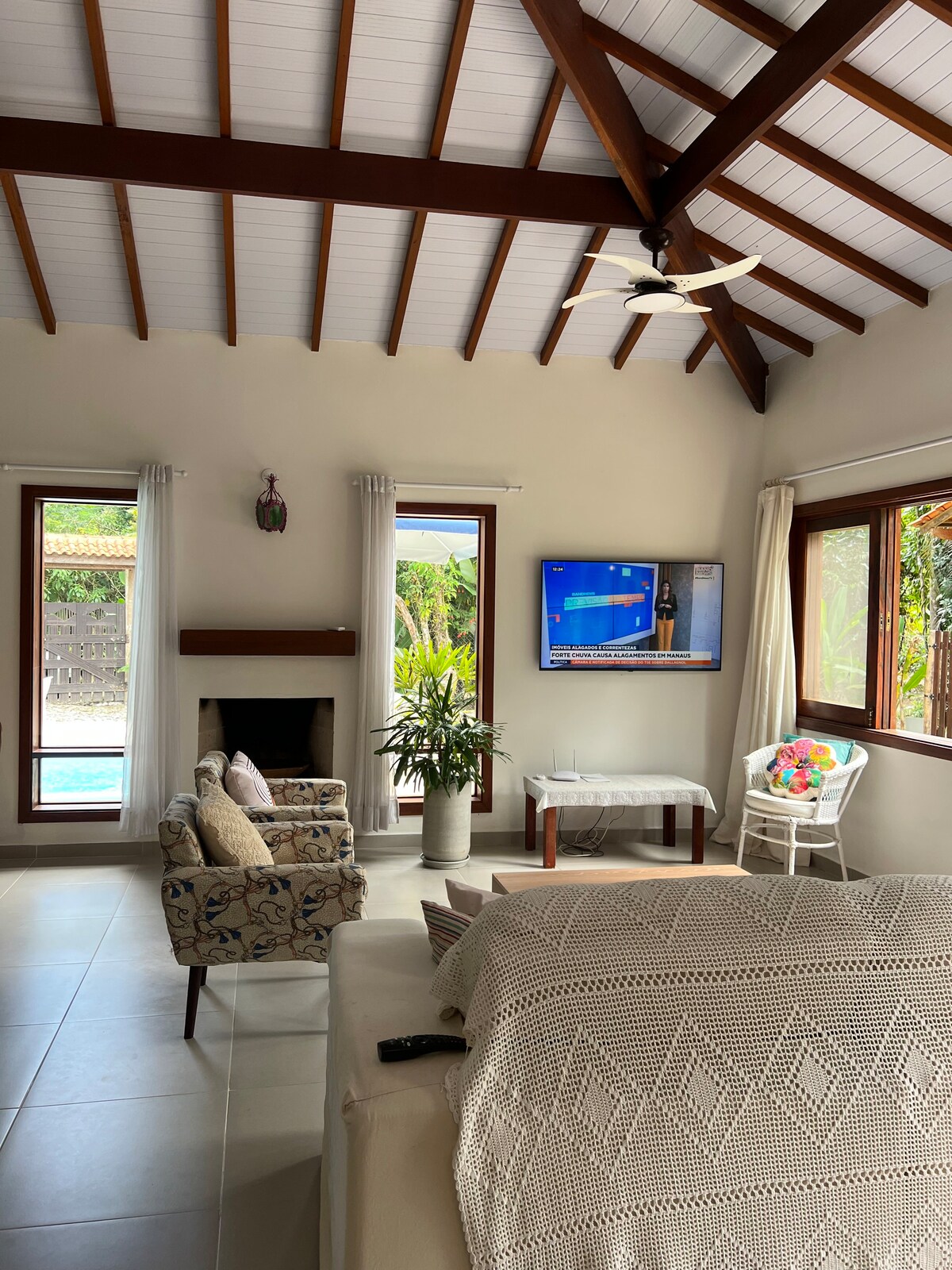 Casa con estilo y comodidad , suite de 5 estrellas (ducha de gas y bañera grande para dos con agua, aire acondicionado, ventilador de techo, colcha queen de calidad, sábanas de algodón de 400 hilos,TV, WiFi rápido: dos proveedores, balcón con red, vista al bosque atlántica y amplio armario. Para tu comodidad adicional: chimenea, cocina completa y quiosco-churrasqueira, piscina para dos sauna y río, todo privado. Jardín vallado para tu mascota. Condominio tranquilo, fácil acceso a las playas.
