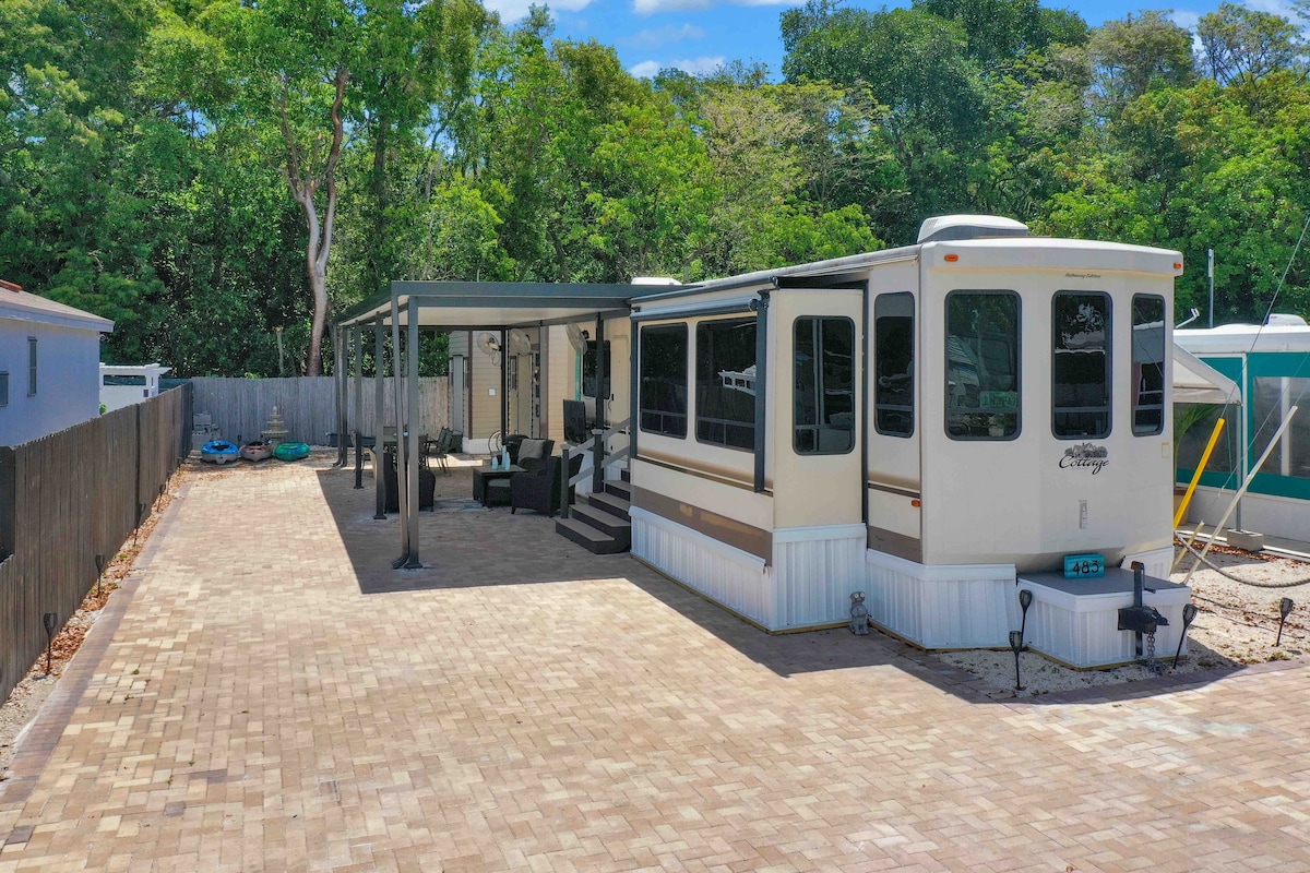 Casa rodante recién reemplazada, lote# 19 en Key Largo Kampground and Marina Resort con seguridad las 24 horas. 1 cama tamaño queen en el loft, sofá cama en la sala de estar, sótano para descansar, cocina completa y baño completo, televisión por cable y wifi. A poca distancia a pie del supermercado Publix, el parque estatal John Pennekamp, pesca en alta mar, barcos de alquiler para buceo y esnórquel, restaurantes. Lote privado muy bien ajardinado todo para ti de aprox. 40' x 60' y está convenientemente cerca de la piscina, rampa para botes con estacionamiento para remolques, lavandería, baño-inodoro.