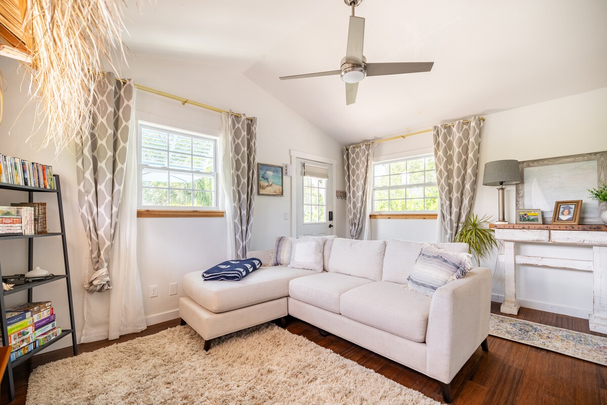 Nuestra acogedora casa de playa boho, The Mango House, es el lugar perfecto para que una pareja o una familia pequeña se relaje y disfrute de las mejores comodidades de Sarasota. Está convenientemente ubicada justo entre ambas entradas de Siesta Key, a poca distancia a pie de restaurantes, tiendas de comestibles, Trader Joe's, gimnasio y a una manzana del popular Walt's Fish Market. Este precioso bungalow es la casa delantera de un dúplex en un gran terreno con mucho espacio exterior privado y acogedor para relajarse y disfrutar de todo el maravilloso clima de Florida.