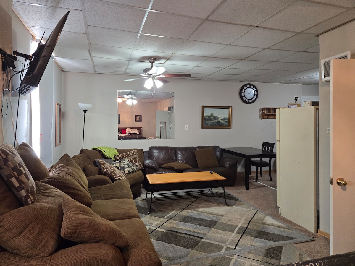 Tranquilo y cómodo apartamento estudio con ducha completa y baño, nevera del tamaño del apartamento y horno tostador, y cafetera. Hay estacionamiento disponible a nivel de la calle en la entrada de los apartamentos, esta unidad está ubicada en el segundo piso sobre un edificio comercial de la calle principal, frente al gas de un Casey. Se encuentra en la misma cuadra que la estación de bomberos y enfrente del ayuntamiento, la biblioteca y la oficina de correos.