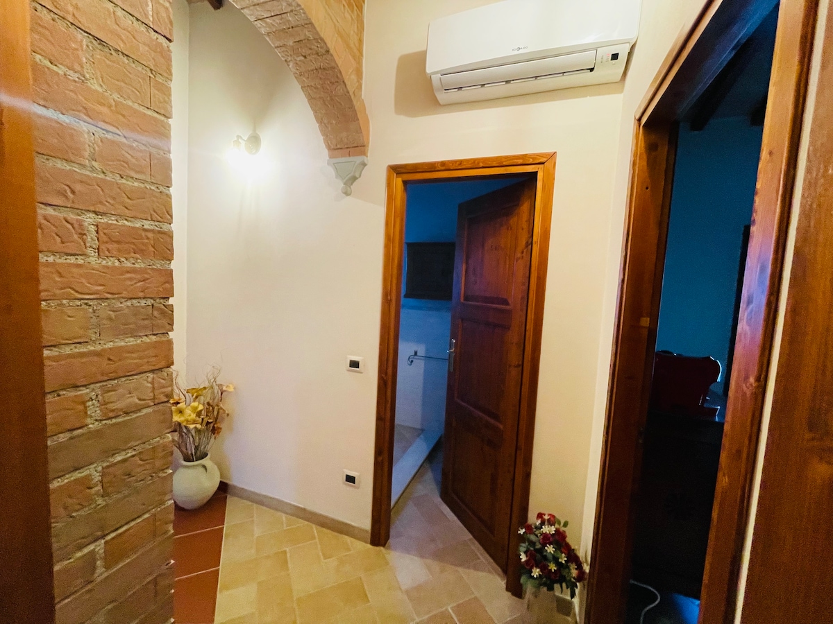 El apartamento forma parte de una típica casa de campo toscana inmersa en la verde campiña. Completamente independiente, consta de cocina totalmente equipada con chimenea, sala de estar con TV y sofá cama, un baño con ducha y un dormitorio doble.