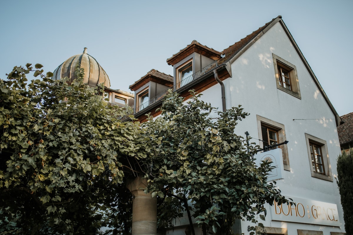 Nuestro loft luminoso y tranquilo en el corazón del casco antiguo de Deidesheim le ofrece todo lo que necesita en dos plantas: una plaza de aparcamiento privada frente al apartamento, aire acondicionado, calefacción por suelo radiante, cama king size (180 cm de ancho), wifi (aprox. 40 Mbit), Netflix, cocina totalmente equipada y asientos en el hermoso patio interior mediterráneo. Los restaurantes de alta cocina, la taberna de vinos rústica o la panadería están a pocos minutos a pie.